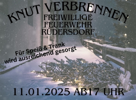 Am Samstag, den 11. Januar 2025 veranstaltet die Freiwillige Feuerwehr Rüdersdorf ab 17:00 Uhr Knut verbrennen. Für Speis und Trank wird ausreichend gesorgt.
