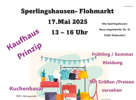 Wir veranstalten in der Kita Sperlingshausen einen Flohmarkt nach Kaufhausprinzip für Baby-/Kinderkleidung bis Gr. 176 (je nach Verfügbarkeit), Spielzeuge etc. Das Kaufhausprinzip meint, dass jedes angebotene Teil mit einem Preis und der Größe ausgezeichnet ist. Die Waren werden am Tag des Flohmarktes nach Größen/Themen geordnet, es wird keine einzelnen Verkaufsstände geben. Bezahlt werden die Waren beim Verlassen des Flohmarktes an der „Kasse“. Die Käuferinnen und Käufer können sich so gezielt umsehen, in Ruhe stöbern und am Ende ihre Waren bezahlen.