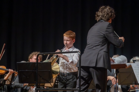 Geboren im Oktober 2013 in Berlin entdeckte David Karl Jakob Grünewälder im Alter von sechs Jahren das Horn für sich. Zuvor hatte er bereits als Fünfjähriger begonnen, Blockflöte und Violine zu erlernen. Im häuslichen Streichquartett mit seinen Eltern und seiner älteren Schwester spielt er die Viola, außerdem sehr gern Klavier. Doch das Horn steht für David im Mittelpunkt seines musikalischen Lebens. Mit diesem Instrument gewann er nicht nur seit 2023 beim Wettbewerb Jugend Musiziert jährlich erste Preise auf Landes-ebene, sondern im Herbst 2024 auch den 1. Preis des JCB-Awards Hamburg. Sein Lehrer an der Mu-sikschule „Béla Bártok“ in Berlin-Pankow ist Christian W. Petersen. David nahm außerdem an Meis-terkursen von Sybille Mahni, Professorin an der Hochschule für Musik „Hanns Eisler“ Berlin, teil.