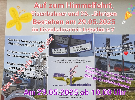 Am 29. Mai 2025 zum Himmelfahrtstag wird beim Eisenbahnverein Letschin e.V. der 26. Geburtstag des Vereins gefeiert.