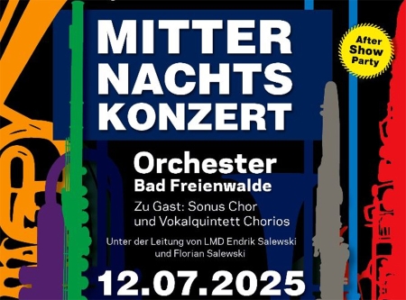 Am Samstag, den 12. Juli 2025 findet ab 21:00 Uhr auf der Freilichtbühne Bad Freienwalde ein Mitternachtskonzert des Orchesters Bad Freienwalde statt. Das Orchester steht unter der Leitung von LMD Endrik Salewski und Florian Salewski.