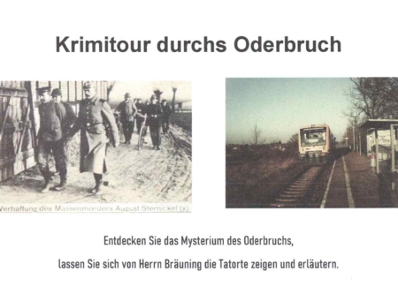 Unter dem Titel Auf den Spuren des Raubmörders August Sternickel durch das Oderbruch startet eine Bustour um 10:00 Uhr am Busbahnhof in Seelow. Die Rückfahrt ist 16:00 Uhr. Der Preis beträgt je Person 60,00 Euro.