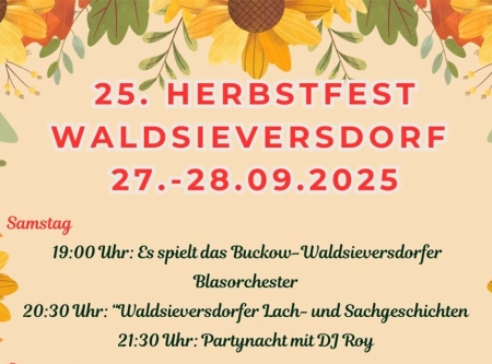 Das diesjährige Waldsieversdorfer Herbstfest wird von Gemeinde und Heimatverein wieder auf dem Festplatz vom 27. und 28. September 2025 organisiert.