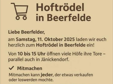 Am Samstag, den 11. Oktober 2025 vom 10:00 Uhr bis 15:00 Uhr öffnen die Höfe zum Hoftrödel in Beerfelde und in Jänickendorf.