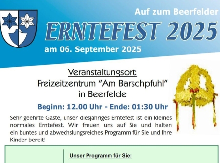 Am 6. September 2025 findet von 12:00 Uhr bis 01:30 Uhr das Beerfelder Erntefest im Freizeitzentrum Am Barschpfuhl statt.