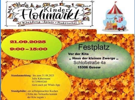 Am 21.09.2025 findet von 09:00 Uhr bis 15:00 Uhr in Gusow vor der Kita Haus der Kleinen Zwerge in der Schlosstraße 4a ein Kinderflohmarkt für Kleidung und Spiele statt.