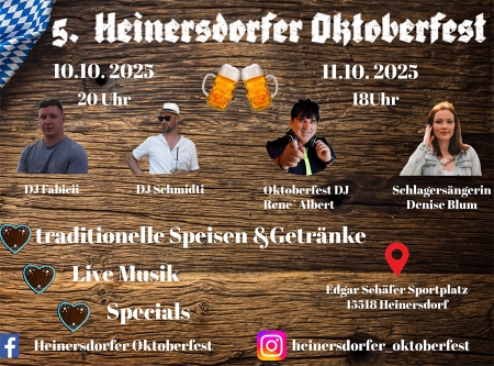 Am Freitag, den 10.10.2025 ab 20:00 Uhr und Sonnabend, den 11.10.2025, ab 18:00 Uhr findet das 5. Heinersdorfer Oktoberfest auf dem Edgar-Schäfer-Sportplatz statt.