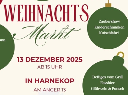 Der diesjährige Weihnachtsmarkt in Harnekop findet am Samstag, den 13. Dezember 2025 ab 15:00 Uhr Am Anger 13 statt.