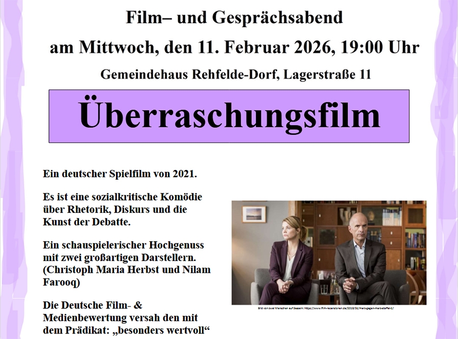 Sie sind herzlich eingeladen zum Film– und Gesprächsabend am Mittwoch, den 11. Februar 2026, 19:00 Uhr Gemeindehaus Rehfelde-Dorf, Lagerstraße 11 Überraschungsfilm