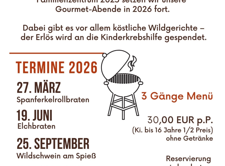 Seit 2022 stehen wir mit Leidenschaft für hochwertiges Grillen, besondere Wildgerichte und soziales Engagement. Nach den erfolgreichen Abenden der letzten Jahre setzen wir unsere Veranstaltungsreihe auch 2026 fort – mit einem abwechslungsreichen 3-Gänge-Menü, viel Genuss und guter Gesellschaft.