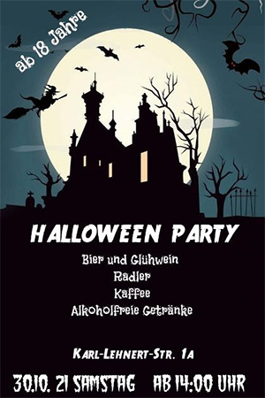 Das Team der Strausberger Hopfburg lädt am 30. Oktober 2021 ab 14:00 Uhr zu einer Halloween Party für Teilnehmer ab 18 Jahre in die Karl-Lehnert-Straße 1A ein. Für Bier und Glühwein, Radler, Kaffee und alkoholfreie Getränke ist gesorgt.