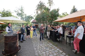 Die Gesprächsgruppen wechselten ständig, so gab es einen regen Austausch zwischen den gastronomischen Anbietern. Der Gastgeber ließ sein Küchenteam ein sehr leckers Buffet auftafeln. Dieses rundete den Abend ab.