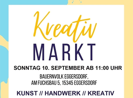 Nach der erfolgreichen Premiere soll dieser sehr spezielle Markt mit vielen Angeboten von und für Kreative widerholt werden. Ein Tag voller Kreativität und live-Musik. Auf dem Hof an der Fachwerkscheune im Gewerbegebiet Am Fuchsbau 5 in Eggersdorf reihen sich Zelt an Zelt mit erstaunlichen Auslagen. Spezielle Angebote laden auch Kinder ein, direkt vor Ort selbst kreativ zu werden. Neben wunderbarer Kunst und tollem Handwerk ist auch für das leibliche Wohl gesorgt. Es gibt Kaffee, Kuchen, Grillwurst und Getränke. Der Eintritt ist frei!