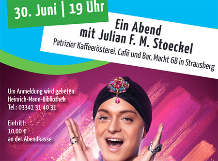 Die Heinrich-Mann-Bibliothek Strausberg lädt am 30. Juni 2023 um 19:00 Uhr zu einem Abend mit Julian F.M.Stoeckel in die Patrizier Kaffeerösterei in den Markt 6 B nach Strausberg ein.