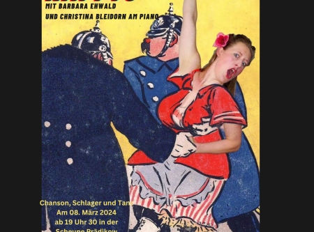 Liebe sämtliche Mädels, liebe Menschen in der weiteren Nachbarschaft dieses schönen Dorfs, seid herzlich eingeladen zu einem unterhaltsamen Abend mit der Entertainerin und Berlinerpflanzen-Frontfrau des Swing Chanson Ensembles AMSELFON Barbara Ehwald, die die Prädikower Frauentags- Fete in der Schene Prädikow und im Schwarzen Storch mit einem humorvollen Blumenstrauß an Anekdoten, Chansons und Schlagern anheizen wird. Begleitet wird sie von der ebenfalls unruhigen Berliner Pflanze Christina Bleidorn, einer zauberhaften Pianistin, die schon seit den 80iger Jahren über die östlichen Tasten der Hauptstadt fegt. Es werden Lieder der letzten Jahrzehnte über und an starke Frauen in der Stadt und auf dem Land erklingen. Wir hoffen, das eine oder andere Lied ist Euch bekannt, das eine oder andere neu. Wenn de jetze nich weesst wat ick meine denn sa‘ ick mal „Das bisschen Haushalt macht sich von allein, sacht mein Mann…“ oder „ Raus mit den Männern aus‘m Reichstach!“ (Claire Waldoff) oder „augenblicklich fühl ick mich unbeschreiblich weiblich!“ ( Nina Hagen)