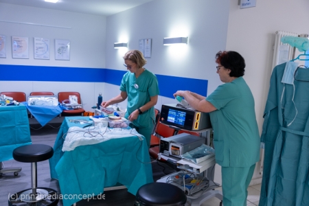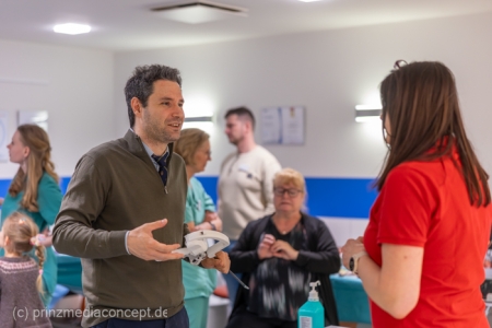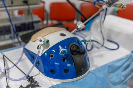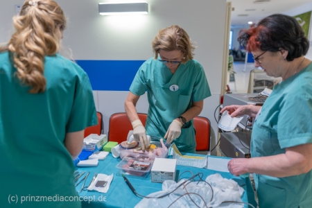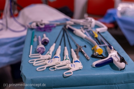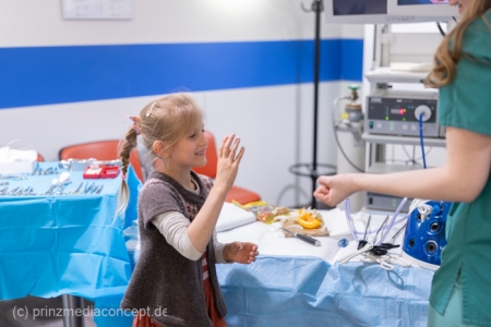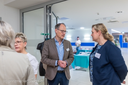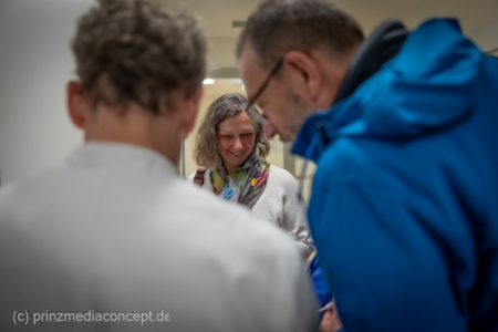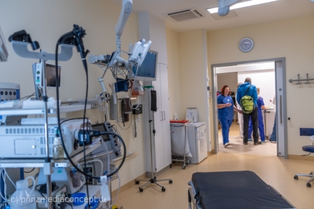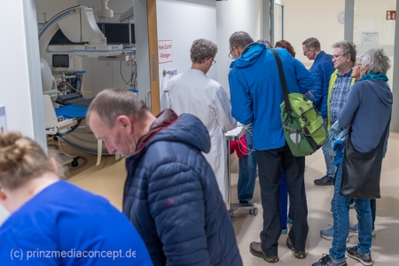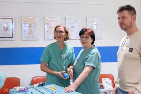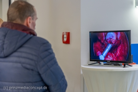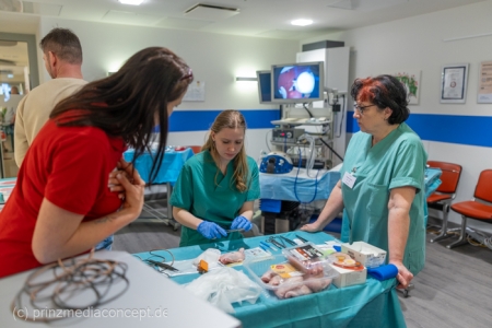 Für besondere Einblicke sorgten die Führungen durch die Endoskopieabteilung durch Dr. Matthias Hüttig, Chefarzt der Klinik für Innere Medizin und stellvertretender Zentrumsleiter. Es gab Informationen zu den Themen Psycho-Onkologie, Palliativmedizin, der Bedeutung des Sozialdienstes und den Abläufen auf den Stationen des Zentrums. Wer wollte konnte seine Geschicklichkeit in einem kleinen chirurgischen Trainings-Parcours testen. Hier gab es Trainingsgeräte für die sogenannte Schlüsselloch OP, auch das Nähen von Haut konnte geübt werden.
