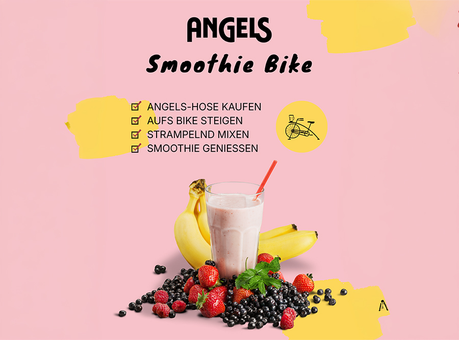 Am Samstag gibt es noch eine Aktion von Angels: Das Smoothie Bike ist da. Wer eine Angels-Hose kauft, darf aufs Bike steigen und sich seinen Smoothie selbst mixen.