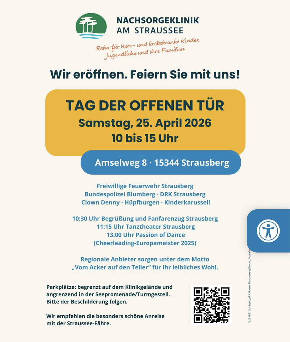 Am Samstag, den 25. April 2026 findet von 10:00 Uhr bis 15:00 Uhr ein Tag der offenen Tür in der Nachsorgeklinik am Straussee statt. Die Klinik ist für die Reha für herz- und krebskranke Kinder, Jugendliche und ihre Familien ausgerichtet.