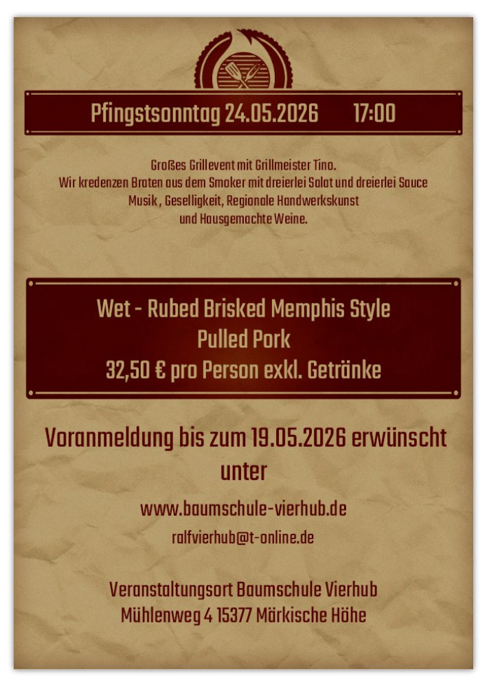 Am Pfingstsonntag, den 24. Mai 2026 lädt die Baumschule Vierhub ab 17:00 Uhr zu einem besonderen Gillabend ein.