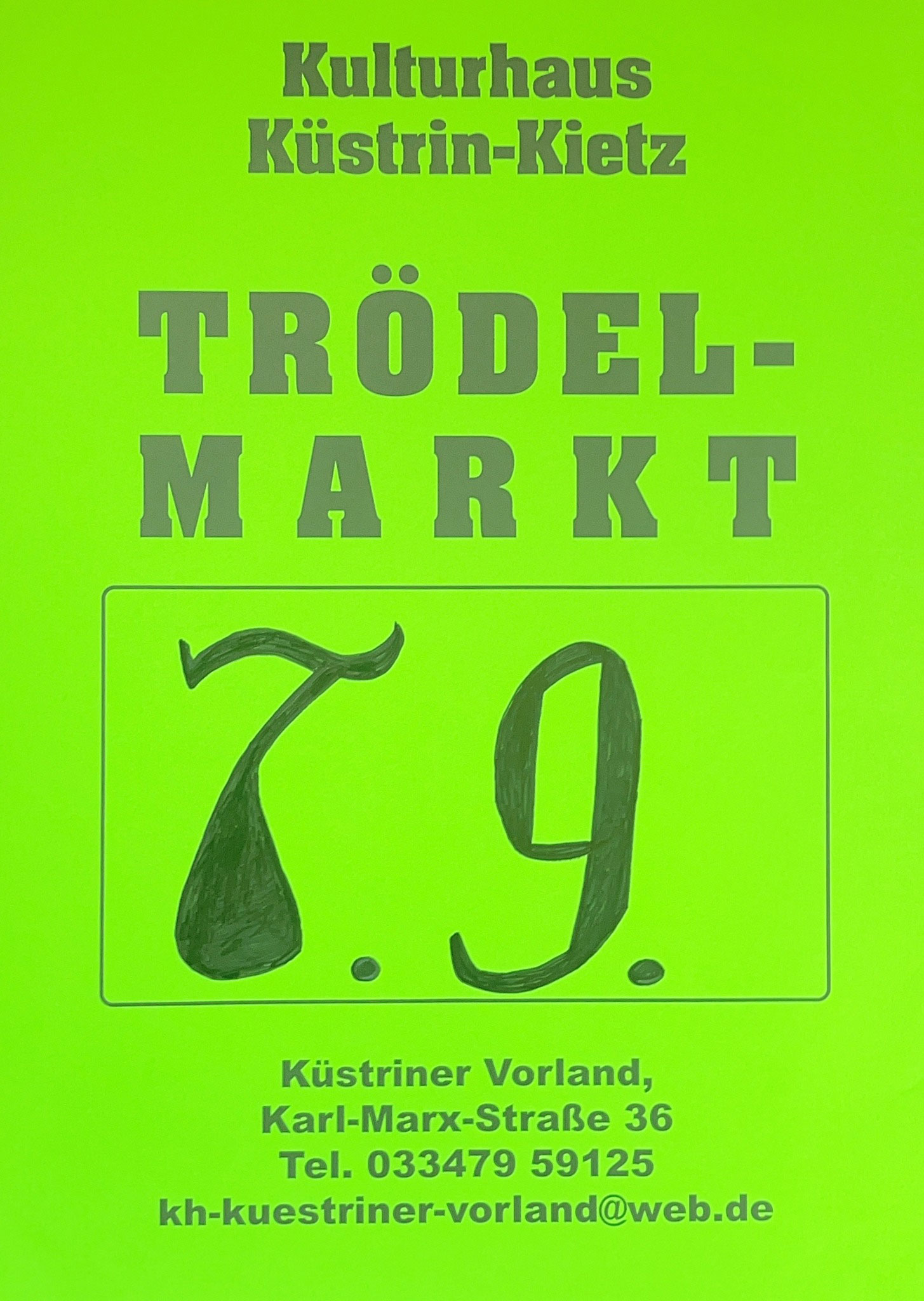 Am 7. September 2024 ab 09:00 Uhr findet auf dem Gelände vom Kulturhaus in Küstrin-Kietz der nächste Trödelmarkt statt. Die Standgebühr beträgt pro Quadratmeter nur 1,00 €, es besteht die Möglichkeit das Auto am Stand zu parken. Das Kulturhaus liegt direkt gegenüber vom Bahnhof in Küstrin-Kietz, dort können die Gäste auch den Parkplatz kostenlos nutzen.