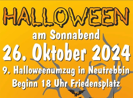 Am Samstag, den 26. Oktober 2024 findet ab 18:00 Uhr der 9. Helloweenumzug in Neutrebbin statt. Er beginnt traditionell am Friedensplatz. Die besten Kostüme für Kinder und Erwachsene werden prämiert. Musik und Unterhaltung gibt es mit DJ Timo. Auch ein Feuerwerk ist geplant.