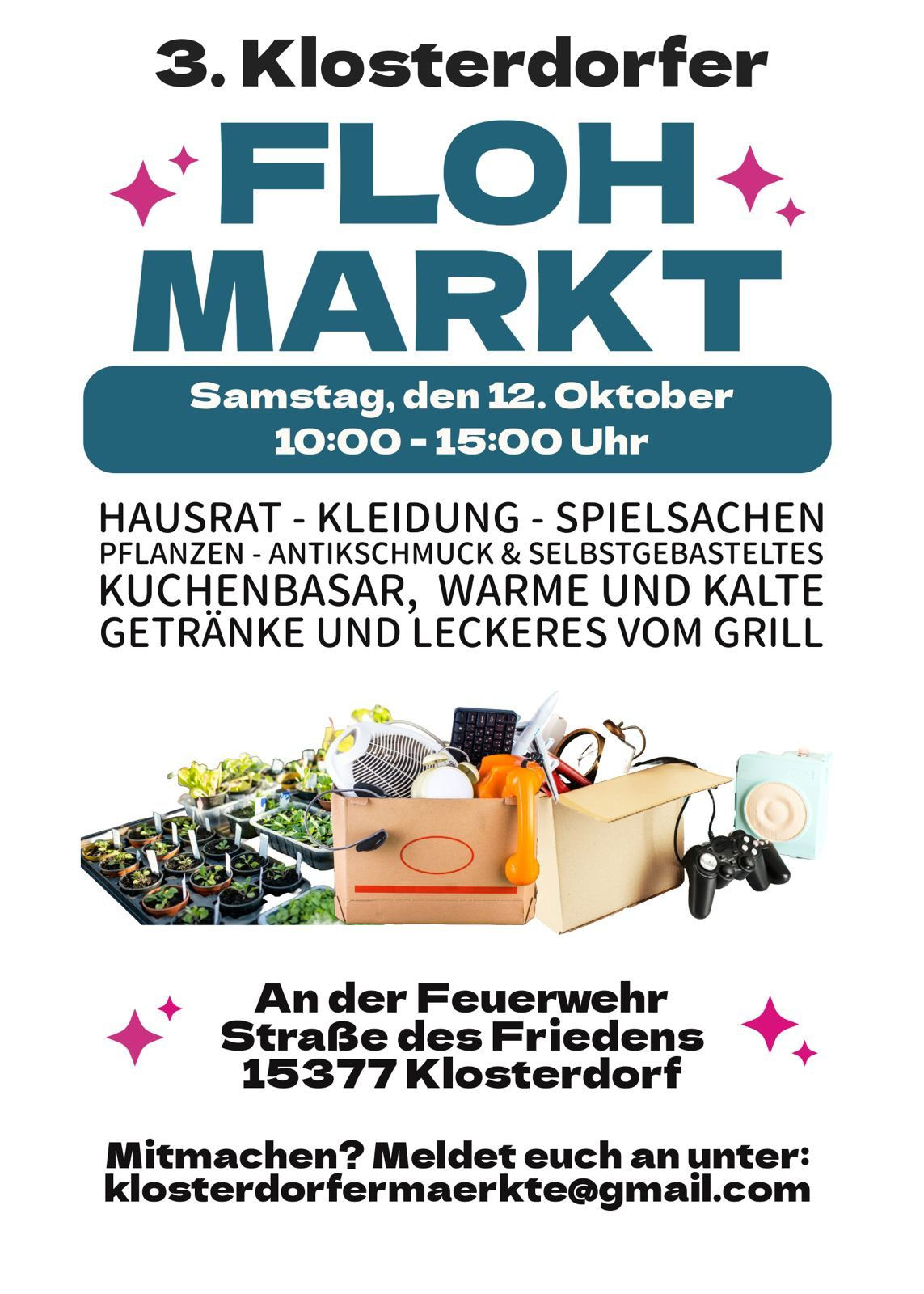 Am Sonntag, den 12. Oktober 2024 findet von 10:00 Uhr bis 15:00 Uhr der Klosterdorfer Trödelmarkt direkt an der Feuerwehr statt. Alle dürfen mitmachen, es gibt keine Standgebühren!