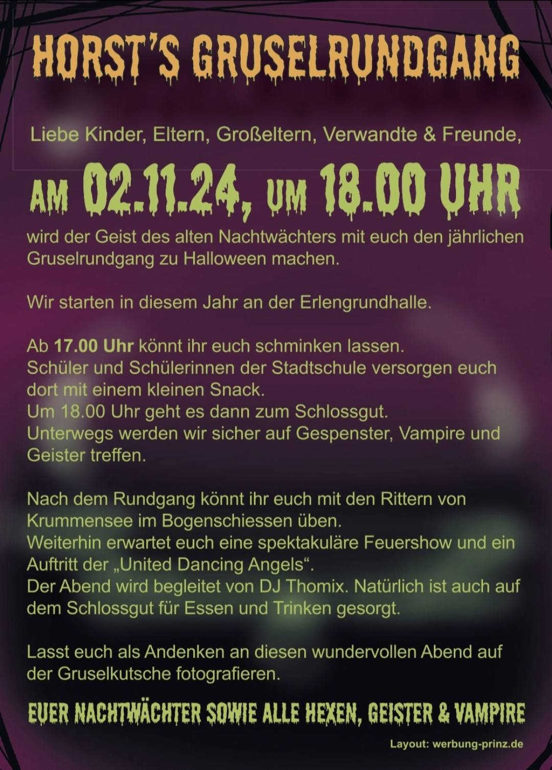 am 02. November 2024 um 18 Uhr wird der Geist des alten Nachtwächters mit euch den jährlichen Gruselrundgang zu Halloween machen.
