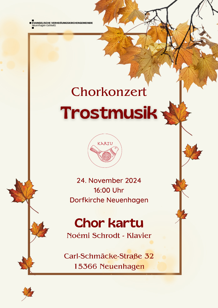 Am 24. November findet um 16:00 Uhr ein Chorkonzert in der Dorfkirche Neuenhagen/Carl-Schmäcke-Straße 32 statt. Die Sängerinnen des Chores "kartu" gestalten ihr Programm a capella und gemeinsam mit der Pianistin Noémi Schrodt. Moderne Chormusik und Improvisationen bringen die alten Mauern in ungeahnte Resonanzen. Die berührende Musik fällt dabei auf den Anlass des Ewigkeitssonntages, dem Gedenktag für Menschen die im letzten Jahr und in der Vergangenheit von uns gingen. Der Eintritt ist frei, um eine Spende am Ausgang wird gebeten.