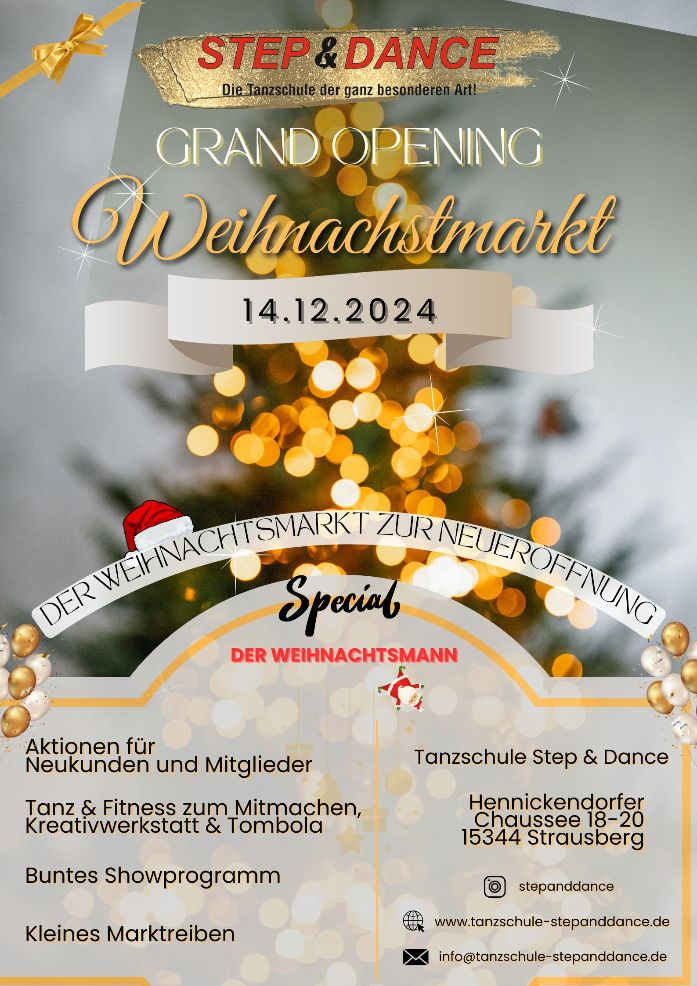 Am Samstag, den 14. Dezember 2024 eröffnet die Tanzschule der ganz besonderen Art Step & Dance in Strausberg, in der Hennickendorfer Chaussee 20, ihren neuen Firmensitz.