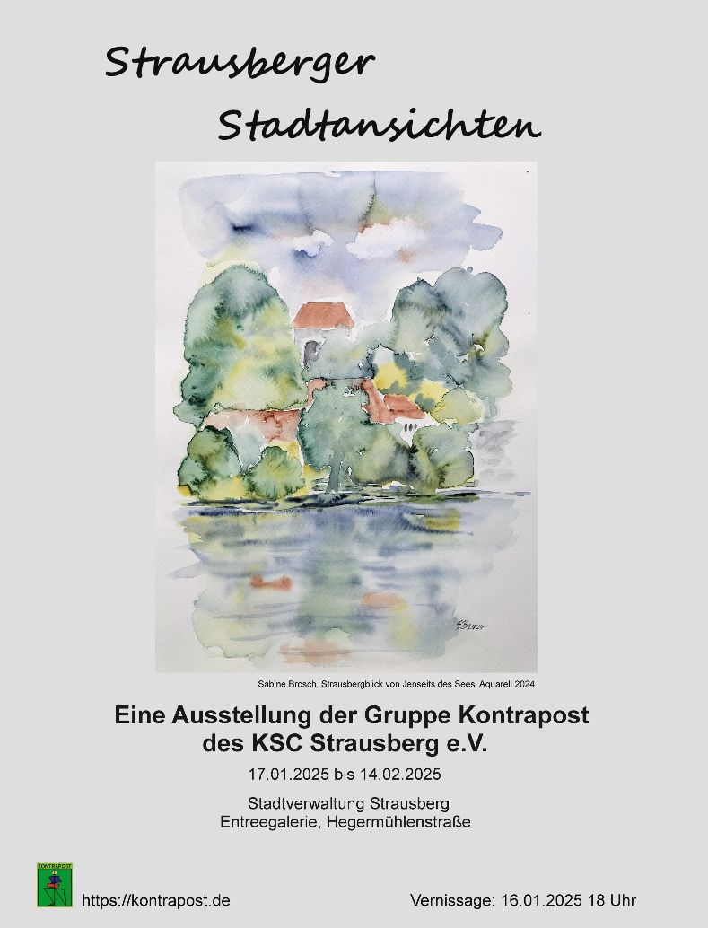 Die Künstlergruppe Kontrapost lädt am 16. Januar 2025 zur Eröffnung einer Ausstellung in die Entreegalerie der Stadtverwaltung Strausberg ein. Die Bilder mit Ansichten der Stadt sind vor allem während der schönen Monate des vergangenen Jahres entstanden. Die Künstler aus Strausberg haben den See, den Lindenplatz, den Markt und den Fischerkietz zu Motiven ihrer in Aquarellfarben gemalten Bilder und Grafiken gewählt.