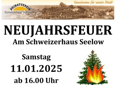 Am Samstag, den 11. Januar 2025 wird ab 16:00 Uhr ein Neujahrsfeuer vom Heimatverein Schweizerhaus Seelow organisiert. Das Feuer wird gegen 17:00 Uhr entzündet. Mit dieser Veranstaltung wird die Jugendfeuerwehr Seelow unterstützt.