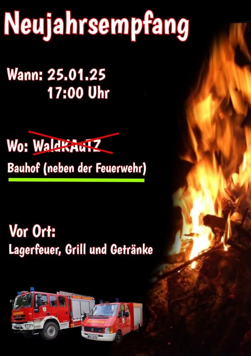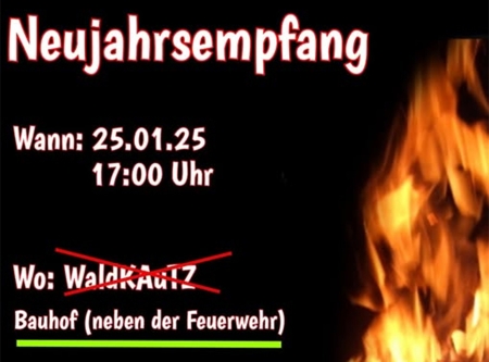 Am Samstag, den 25.01.2025 gibt es ab 17:00 Uhr auf dem Bauhof neben der Feuerwehr in Waldsieversdorf einen Neujahrsempfang mit Lagerfeuer, Grill und Getränken.