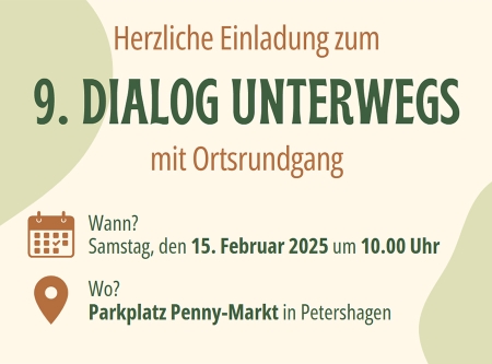 Treffpunkt sind jeweils verschiedene Ort in der Gemeinde, die Bürger können Ihre Anliegen vortragen, ich berichte aus der Arbeit der Gemeindevertretung, großes Interesse besteht oft an Berichten, "wie es früher war". Bisher kamen jeweils ca. 20 Einwohner miteinander ins Gespräch und Ortspolitik wurde im "Dialog unterwegs" erfahrbar.