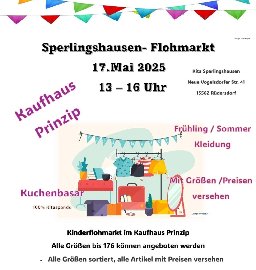 Wir veranstalten in der Kita Sperlingshausen einen Flohmarkt nach Kaufhausprinzip für Baby-/Kinderkleidung bis Gr. 176 (je nach Verfügbarkeit), Spielzeuge etc. Das Kaufhausprinzip meint, dass jedes angebotene Teil mit einem Preis und der Größe ausgezeichnet ist. Die Waren werden am Tag des Flohmarktes nach Größen/Themen geordnet, es wird keine einzelnen Verkaufsstände geben. Bezahlt werden die Waren beim Verlassen des Flohmarktes an der „Kasse“. Die Käuferinnen und Käufer können sich so gezielt umsehen, in Ruhe stöbern und am Ende ihre Waren bezahlen.