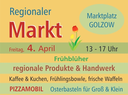 Am Freitag, den 04. April 2025 findet von 13:00 Uhr bis 17:00 Uhr auf dem Marktplatz, Hauptstraße 30, in Golzow ein regionaler Markt statt.