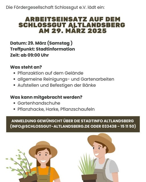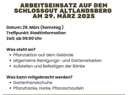 Am Samstag, den 29. März 2025 um 09:00 Uhr lädt die Fördergesellschaft Schlossgut e.V. zum Arbeitseinsatz auf dem Schlossgut ein.
