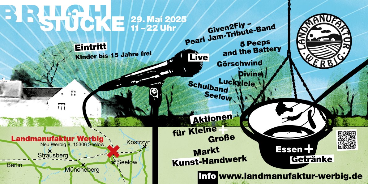 Das Event Bruchstücke im Schutzgebiet findet am 29. Mai 2025 von 11:00 Uhr bis 22:00 Uhr mit einem Kunst Handwerksmarkt, Live-Bands und kulinarischen Überraschungen statt. Neben Aktionen für kleine und große Menschentreten verschiedene Bands auf.