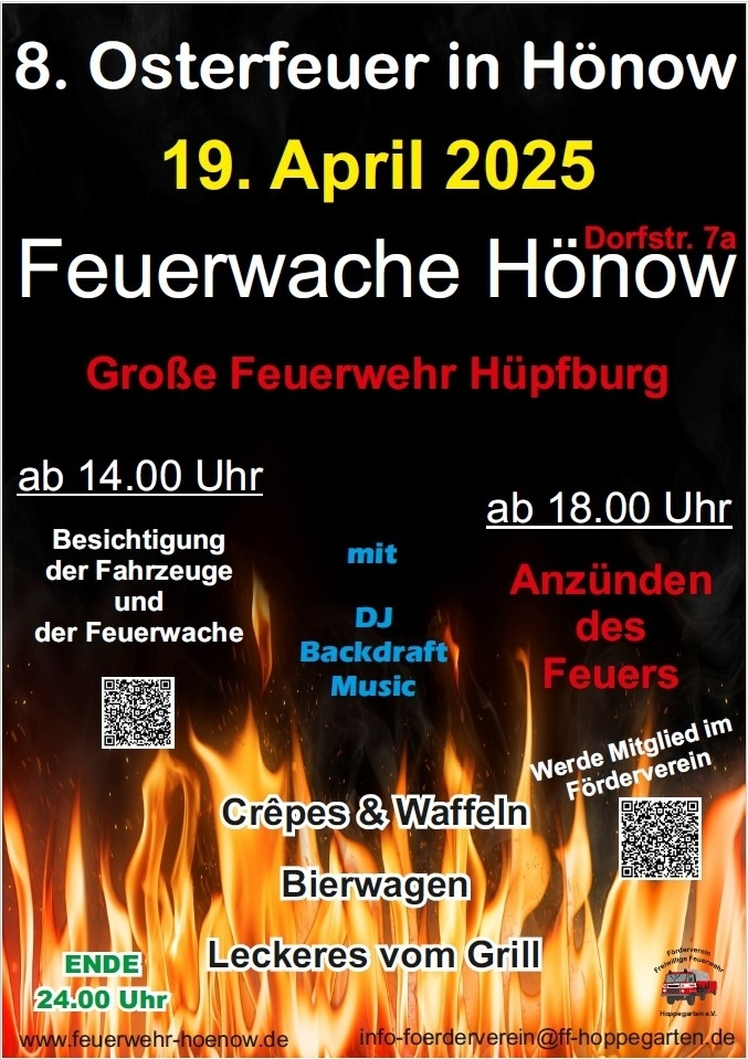 Am 19. April 2025 findet ab 18:00 Uhr das 8. Osterfeuer an der Feuerwache in Hönow (Dorfstraße 7a) statt. DJ Backdraft Music sorgt für gute Unterhaltung.