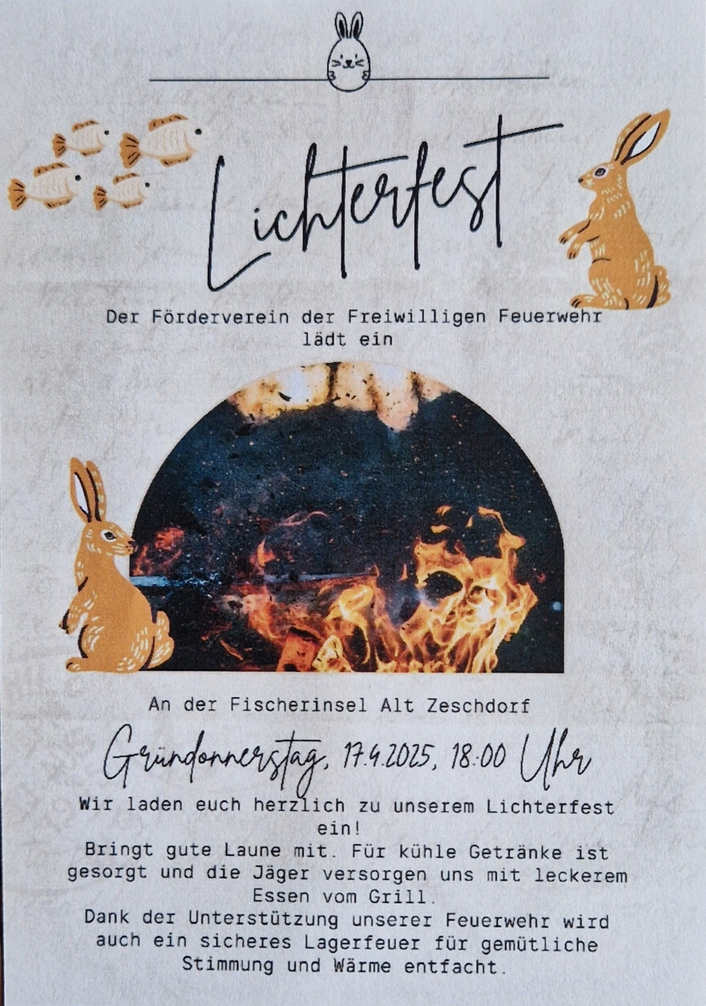 Am Gründonnerstag, 17. April 2025, findet ab 18:00 Uhr das Lichterfest an der Fischerinsel in Alt Zeschdorf statt.