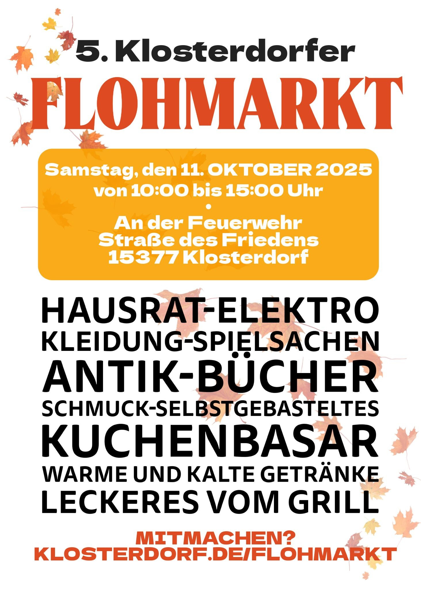 Am Sonntag, den 11. Oktober 2025 findet von 10:00 Uhr bis 15:00 Uhr der Klosterdorfer Trödelmarkt direkt an der Feuerwehr statt. Standgebühr 5 Euro