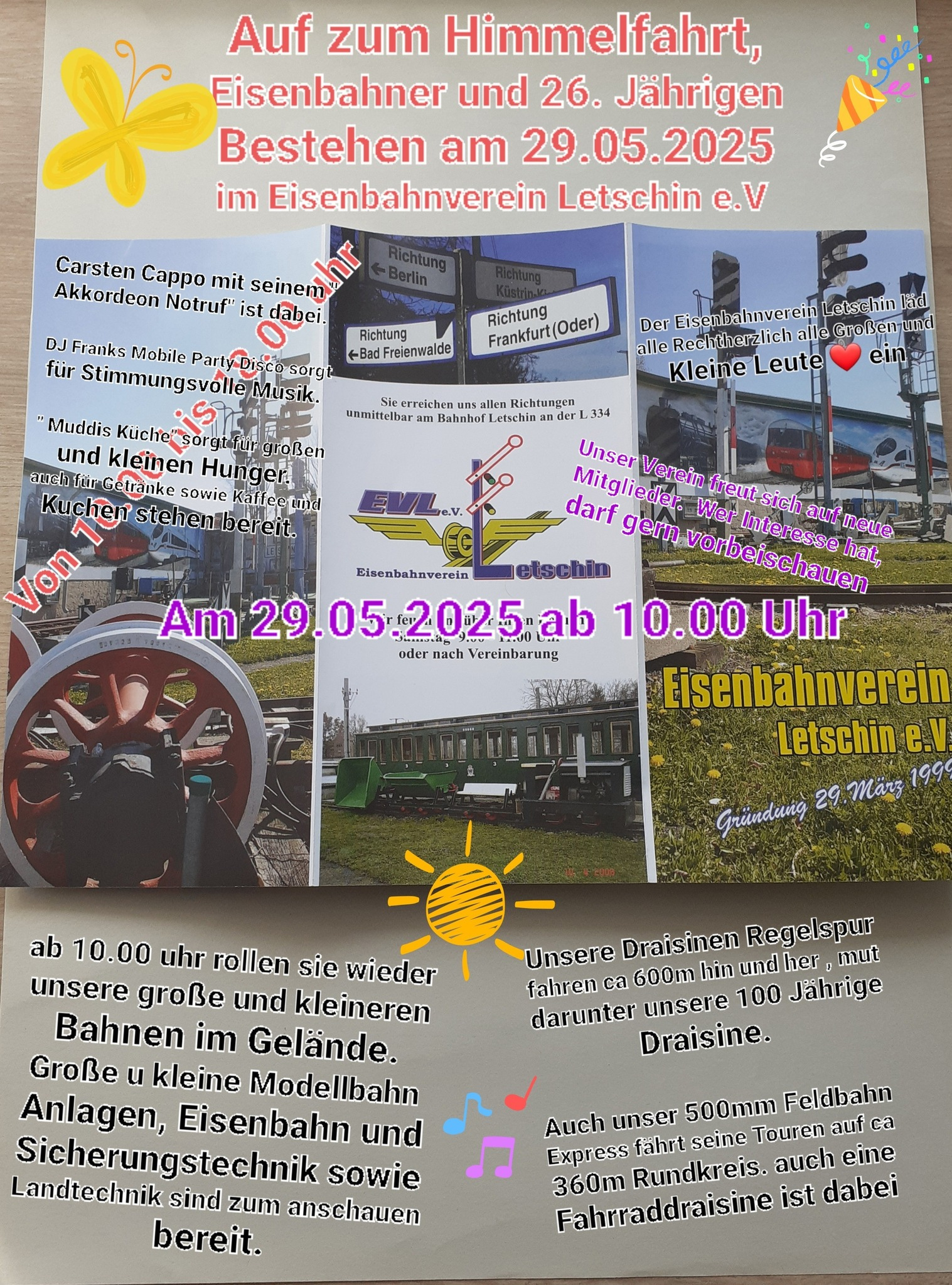 Am 29. Mai 2025 zum Himmelfahrtstag wird beim Eisenbahnverein Letschin e.V. der 26. Geburtstag des Vereins gefeiert.