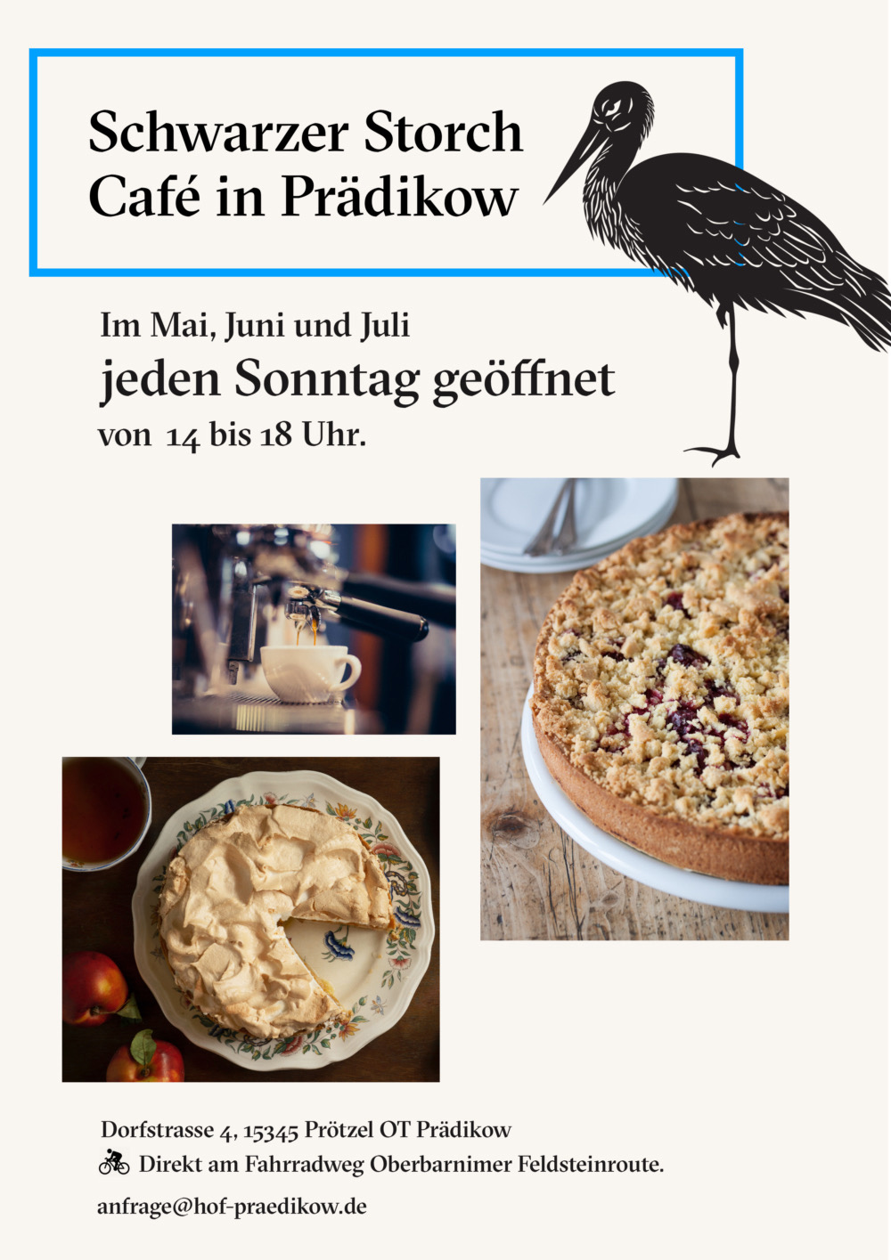 Das Café Schwarzer Storch auf dem Hof Prädikow bietet im Mai, Juni und Juli 2025 jeden Sonntag von 14:00 Uhr bis 18:00 Uhr frischen Kuchen und Kaffee.