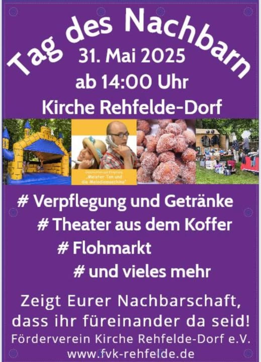 Am 31. Mai 2025 organisiert der Förderverein Kirche Rehfelde-Dorf e.V. ab 14:00 Uhr den Tag des Nachbarn direkt an der Kirche. Zeigt Eurer Nachbarschaft, dass ihr füreinander da seid!