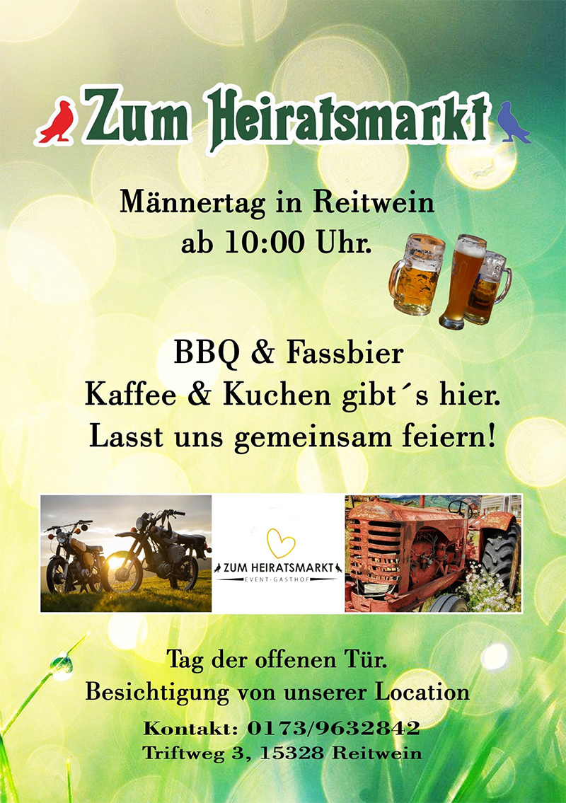 Der Eventgasthof zum Heiratsmarkt in Reitwein lädt am Männertag (29.05.2025) ab 10:00 Uhr nach Reitwein ein. Die Location kann besichtigt werden und natürlich wird gefeiert.