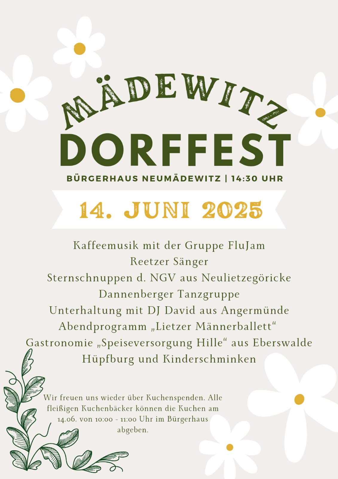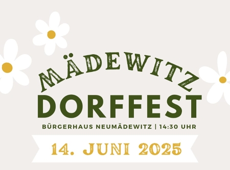 Am 14. Juni 2025 feiert Mädewitz ab 14:30 Uhr im Bürgerhaus Neumädewitz Dorffest.