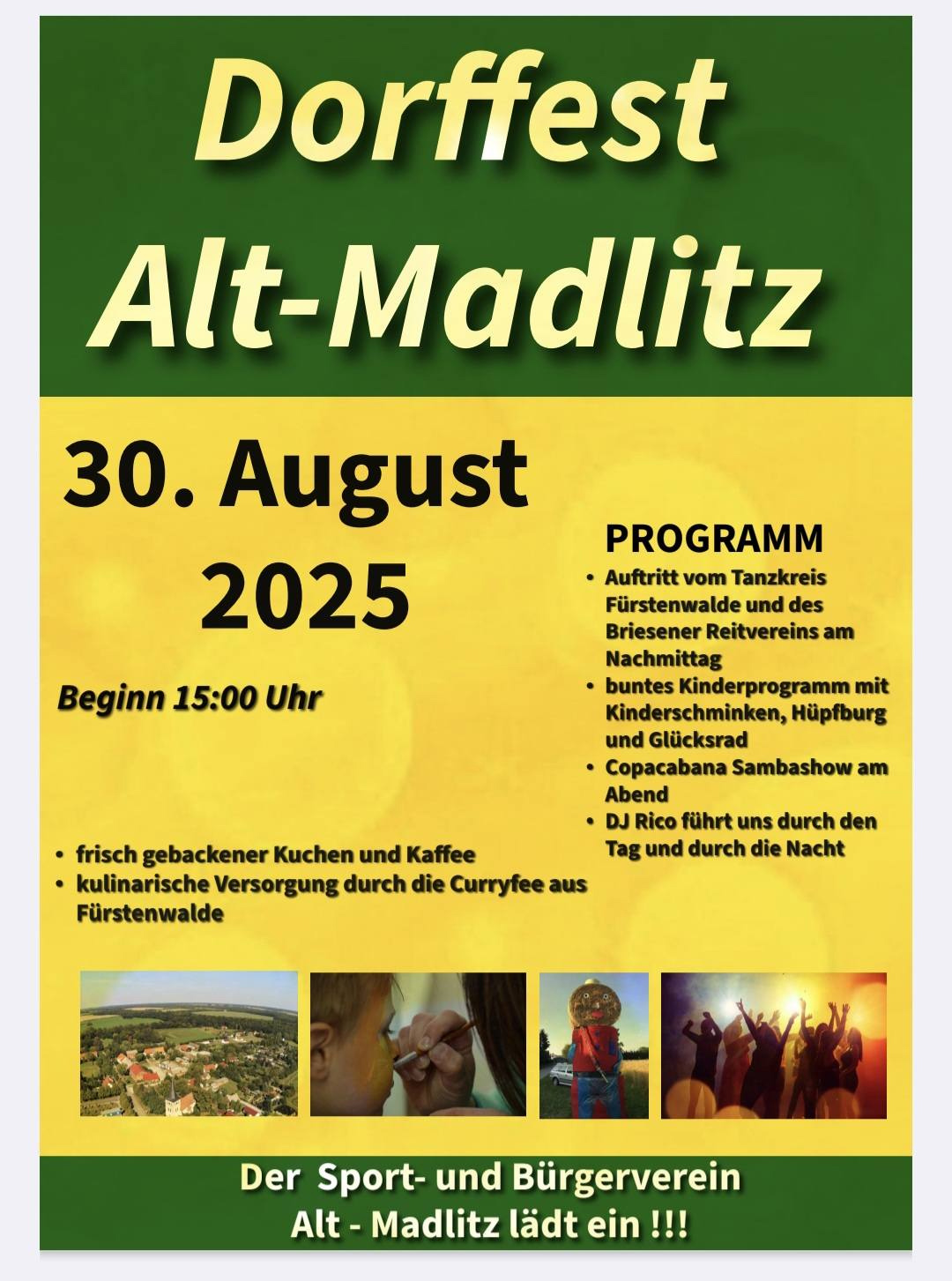 Am Samstag, den 30. August 2025 findet das Dorffest in Alt-Madlitz statt. Der Sport- und Bürgerverein lädt dazu ein.