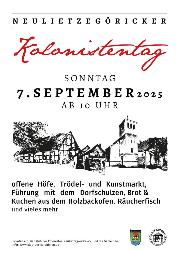 Der Klub der Kolonisten Neulietzegöricke e.V. und die Gemeinde Neulietzegöricke laden auch in diesem Jahr wieder zum traditionellen „Neulietzegöricker Kolonistentag“ ein. Am Sonntag, dem 7. September2025 , ab 10:00 Uhr öffnen viele Höfe im Dorf ihre Pforten für die Besucher und Besucherinnen.