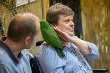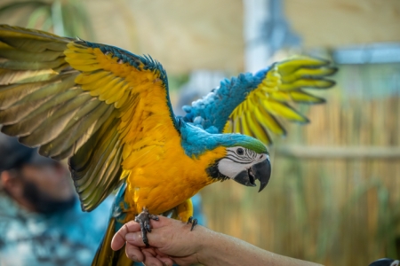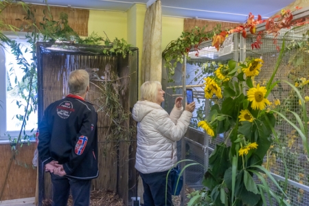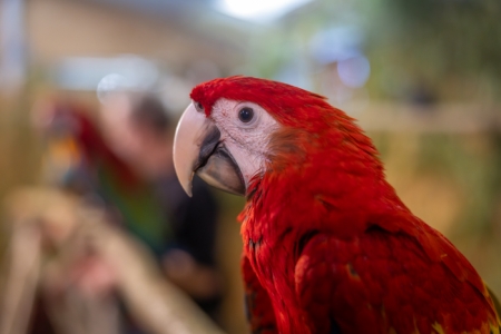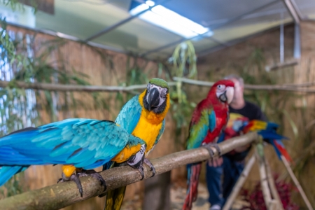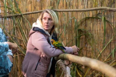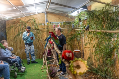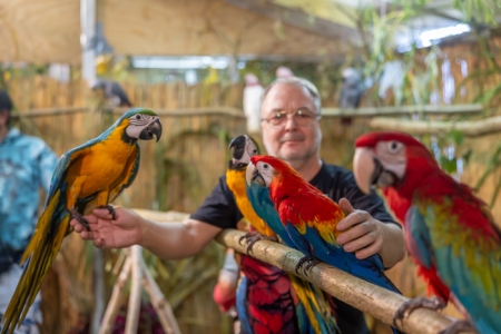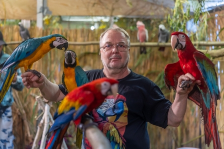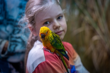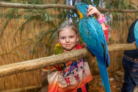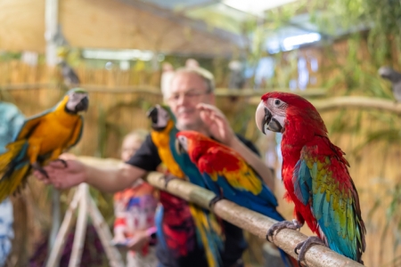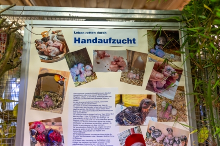 Betreut vom fachkundigen Züchter bereitet das Füttern der handzahmen Papageien, in der 24 m² großen, betretbaren Freiflugvoliere, nicht nur den jungen Besuchern, immer eine besonders große Freude.