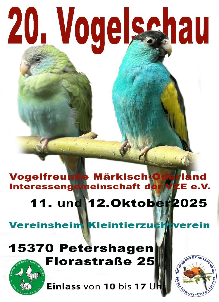 Die Vogelfreunde Märkisch Oderland präsentieren ihre Jubiläumsausstellung in diesem Jahr auf dem Gelände des Vereinsheim der Kleintierzüchter D185, im Doppeldorf Petershagen/Eggersdorf.