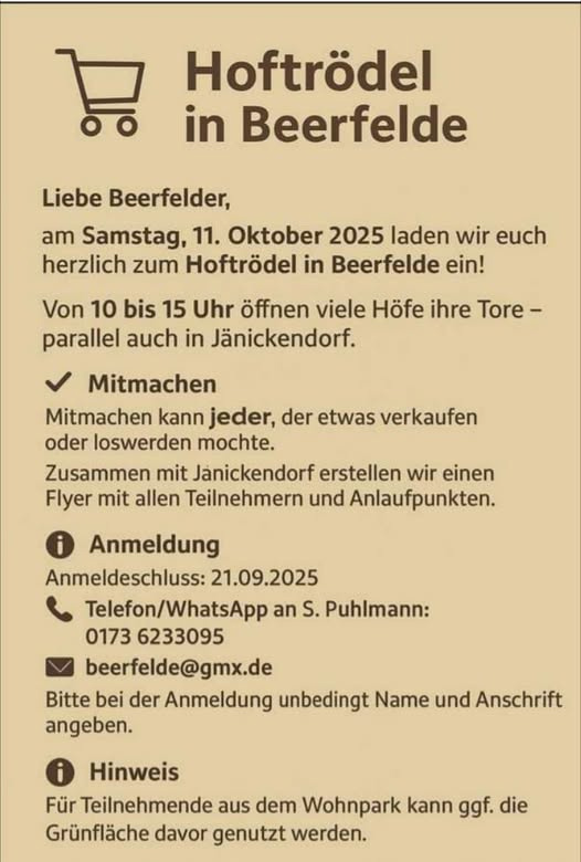 Am Samstag, den 11. Oktober 2025 vom 10:00 Uhr bis 15:00 Uhr öffnen die Höfe zum Hoftrödel in Beerfelde und in Jänickendorf.